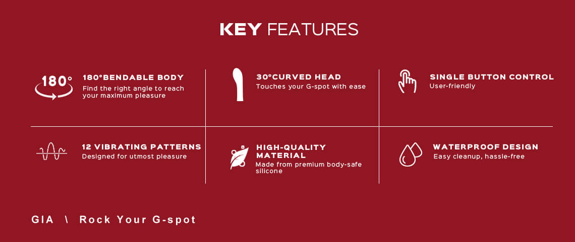 El vibrador Gia para el punto G puede doblarse hasta 180° e incluye un cabezal curvado de 30°. Este vibrador está diseñado para alcanzar fácilmente tu punto G y proporcionarte un masaje intenso y constante que tocará tu punto correcto, de la forma correcta, cada vez.