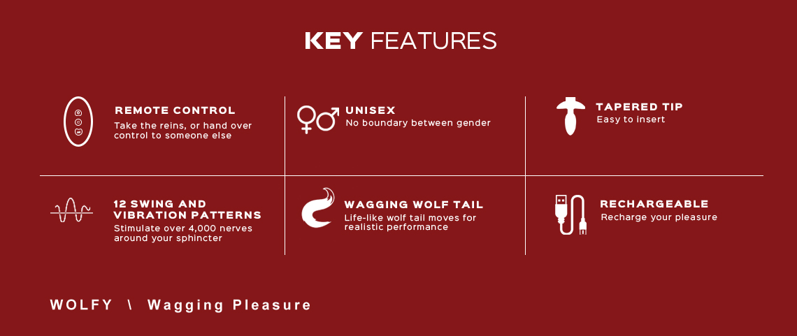 No te limites a seducir a tu pareja con tus movimientos de culo y tu cola anal, deja que sea él o ella quien lleve la correa y controle la vibración de tu plug anal vibrador con solo pulsar un botón. El diseño del plug de cola Wolfy, que es inalámbrico y con control remoto, te permite experimentar un placer salvaje en cualquier lugar de tu casa.