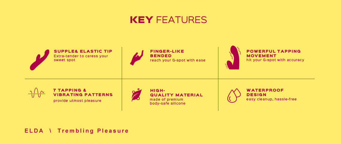 Il n'y a pas de meilleure joie qu'un doigté habile, inspiré par lequel, la tige principale d'Elda est courbée comme un doigt pour atteindre votre zone du point G avec facilité et donne un mouvement de tapotement super rapide plus puissant que jamais.