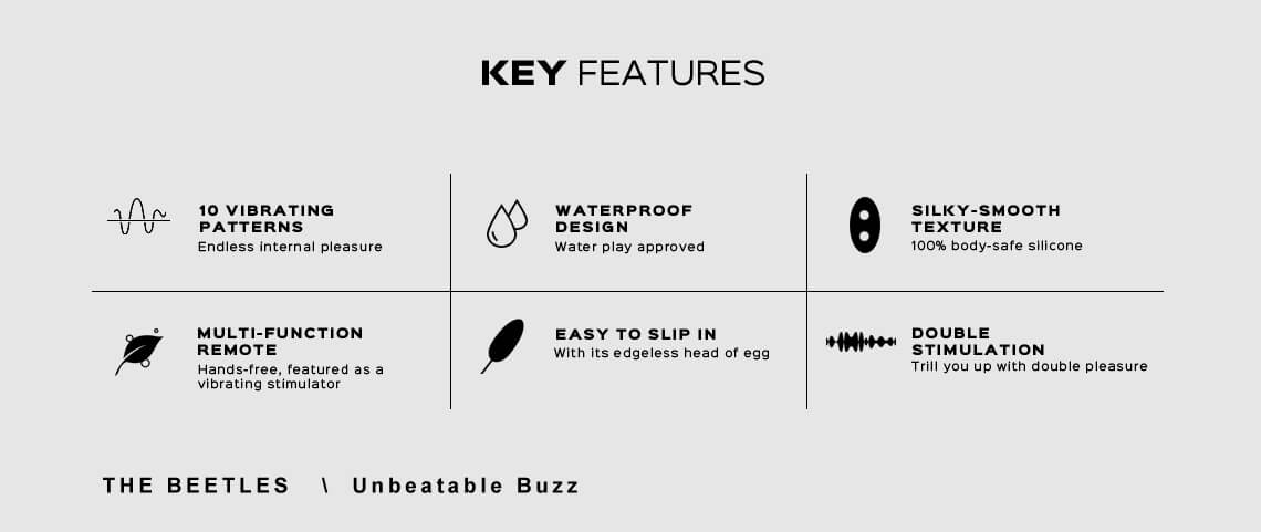La conception étanche vous permet d'accéder à plus de plaisir. - Le silicone 100 % sans danger pour le corps garantit votre santé et la sécurité de toute insertion. Plus de plaisir vous attend, vous et votre partenaire, pour le découvrir ; The Beetles sera là pour vous. ……