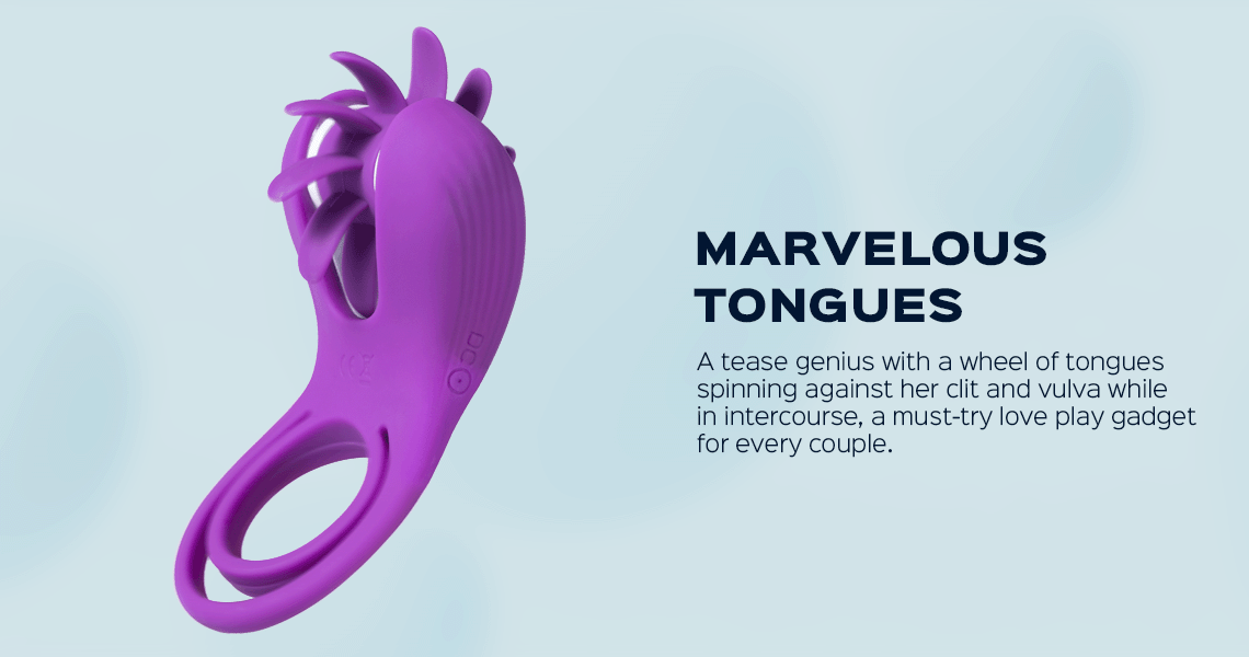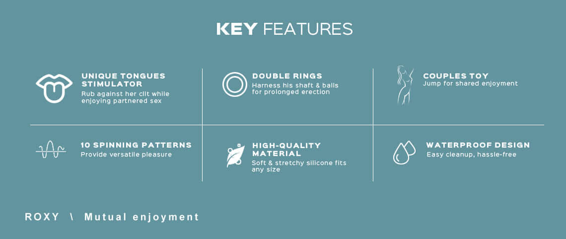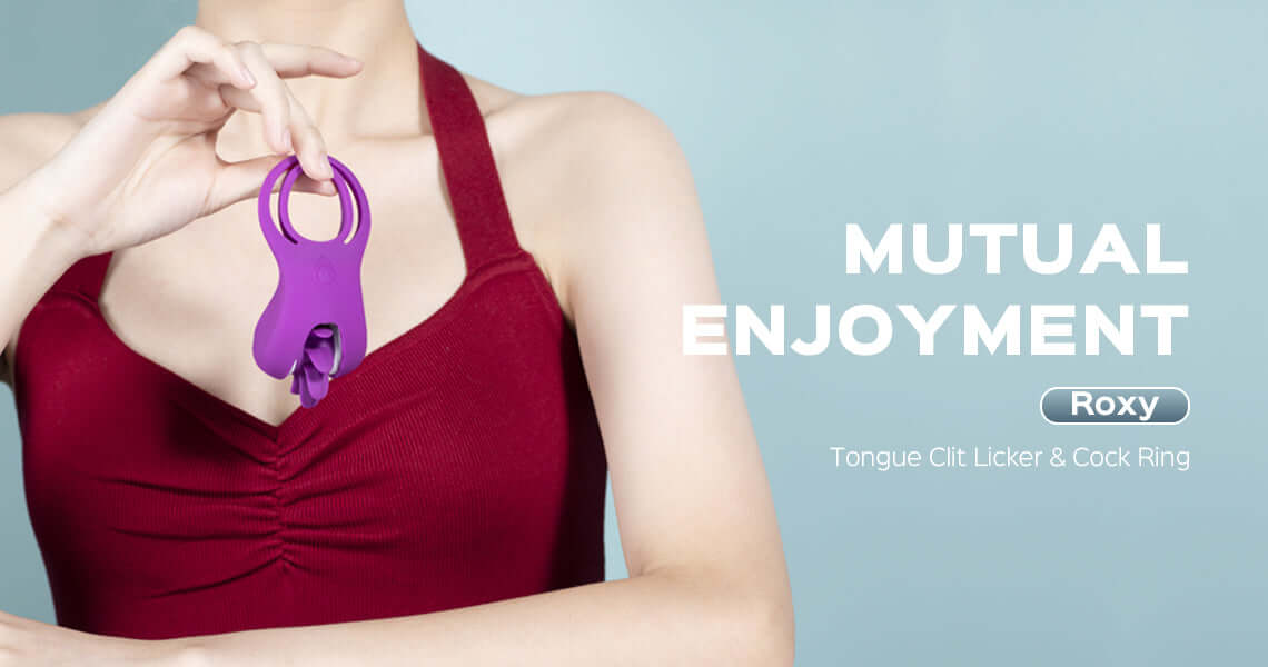 Roxy is unlike any other cock ring or couple’s ring. Its innovative loop of tongue-shaped stimulators “licks” the clit and stimulates the vulva. Every time you move, the wheel spins and brings her pleasure.